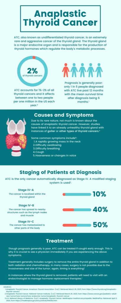 Hi Rita, I enjoyed reading your infographic. I am glad I was able to read more about Anaplastic Thyroid Cancer such that I was unaware of it. Your concise details and visuals helped me understand the severity of ATC. It is heartbreaking to see that prognosis is generally poor and how the timing of detection is important to combat this and proceed with treatment.