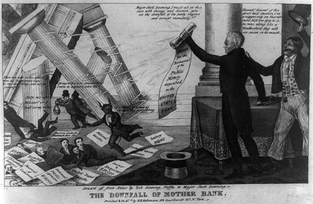 The Second Bank of the United States utilized the federal deposits granted by the government. Jackson, using his executive power, distributed the federal funds to his state-chartered banks.25 Despite Biddle’s handicap as president of the Second Bank, he still maintained control over his banks. To exact retribution against Jackson’s efforts, Biddle and his party painted Jackson as a reckless tyrant who continuously neglected the Constitution.