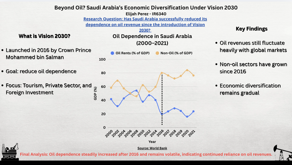 This issue is important because continued reliance on oil exposes Saudi Arabia to economic volatility and external shocks. More broadly, the case highlights the challenges resource-dependent states face in achieving long-term diversification, even with significant policy reforms and financial investment.