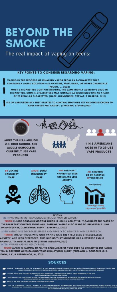 I’d want to begin by expressing that the infographic is concise, straightforward, and effective. The knowledge you shared with your readers is encouraging. I’m eager to learn more about the dangers of electronic cigarettes. Because young middle and high schoolers are vulnerable to the perils of social pressure and puberty, it is apparent that firms will attempt to stay as near to kids as possible while providing or serving in a way that jeopardizes safety by benefiting from the sale of e-cigarettes. People nowadays need to be aware of the consequences of smoking or vaping. Individual well-being should be prioritized because smoking can lead to physical concerns as well as mental and social-cognitive decline. Some e-cigarettes, as you said, include nicotine, which can impair brain regions that affect mood and learning. It is also vital to emphasize the hazards or what may lead someone to use vapes or the fallacies surrounding e-cigarettes, as well as raising awareness about the need not to smoke.
