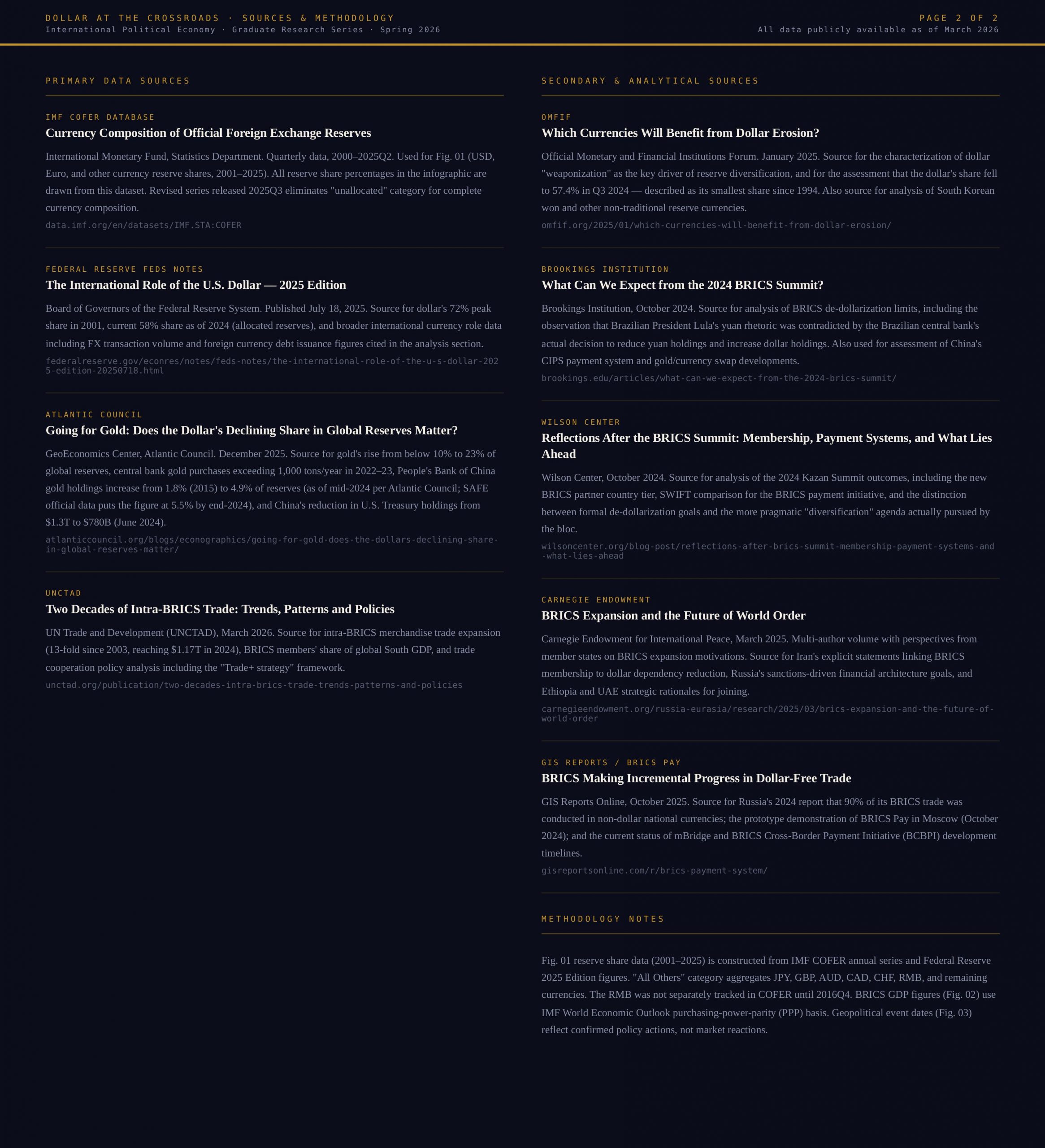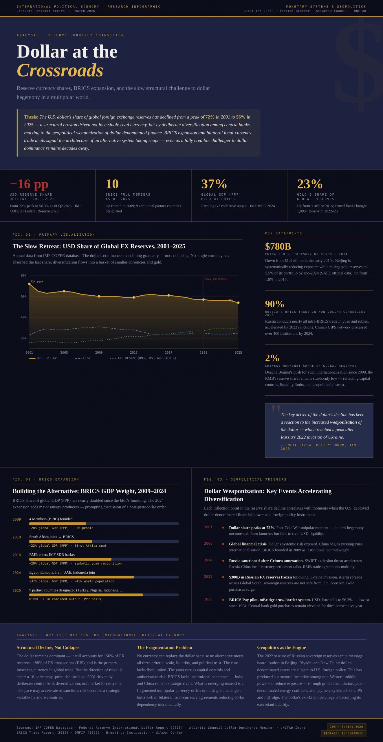 This work argues that the US dollar’s role as the world’s dominant reserve currency is in structural, though not terminal, decline. This information draws on IMF COFER data to show that the dollar’s share of global foreign exchange reserves has fallen from a peak of 72% in 2001 to 56% as of mid-2025, a 16-percentage-point erosion over two decades. Crucially, no single rival currency has absorbed that lost share; instead, central banks have diversified into a basket of smaller currencies and gold, whose share of global reserves has surged from under 10% to 23% since 2015. The BRICS expansion timeline contextualizes this trend: a coalition now representing 37% of global GDP has assembled around a shared interest in reducing dollar dependency. The geopolitical events timeline ties the data to its engine, particularly the 2022 freezing of Russian sovereign reserves, which gave non-Western governments concrete incentive to treat dollar exposure as strategic risk. Taken together, these patterns point not toward a single moment of dollar collapse, but toward the slow, deliberate construction of a parallel financial architecture designed to reduce coercive dependence on US-dominated monetary infrastructure.