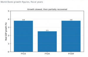 Egypt’s growth fell from 3.8% in FY23 to 2.5% in FY24 before improving to a World Bank forecast of 3.8% in FY25. That pattern shows how macro stabilization can slow activity before confidence and output recover.
