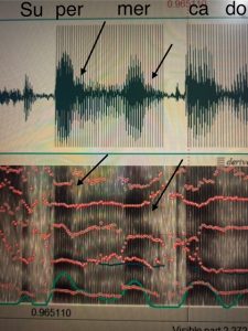 Las imágenes de los espectrogramas de arriba muestran la pronunciación del participante para tres palabras – “para”, “supermercado” y “tortillas”. En la primera imagen, de la palabra “para”, las flechas blancas muestran el golpecito de la [ɾ] simple de forma muy clara, debido a la oscuridad de las vocales [a] en cada lado. La segunda imagen presenta la palabra “supermercado”, con sus dos “r”. Las flechas negras muestran el primer [ɾ] simple, en “super”, que se ve claramente. Sin embargo, el segundo /ɾ/, en “mer”, se desvanece en la sílaba tónica. Esta/ɾ/ parece entrecortada, probablemente por la consonante [k] que la sigue y la pausa que hizo el participante. Las flechas en la tercera imagen, que presenta la palabra “tortillas”, apuntan al golpecito de la vibrante simple [ɾ]. En la palabra “tortillas”, mi participants la pronuncia como la vibrante simple [ɾ].