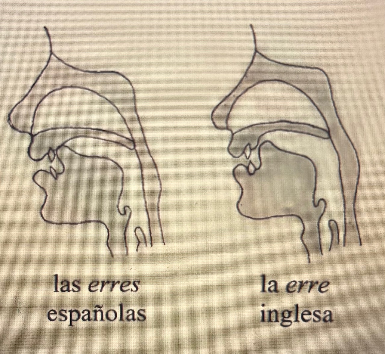 Puede parecer complicada la “r” española, porque es tan diferente de la “r” inglesa. Esto es porque la “r” en inglés es una aproximante retrofleja. Esto quiere decir que, cuando se produce, la lengua no llega a hacer contacto con nada (Face, 2006; Morgan, 2010), a diferencia de la “r” en español en que sí hace contacto la lengua con los alveolos. La imagen al lado demuestra la diferencia entre estos sonidos.