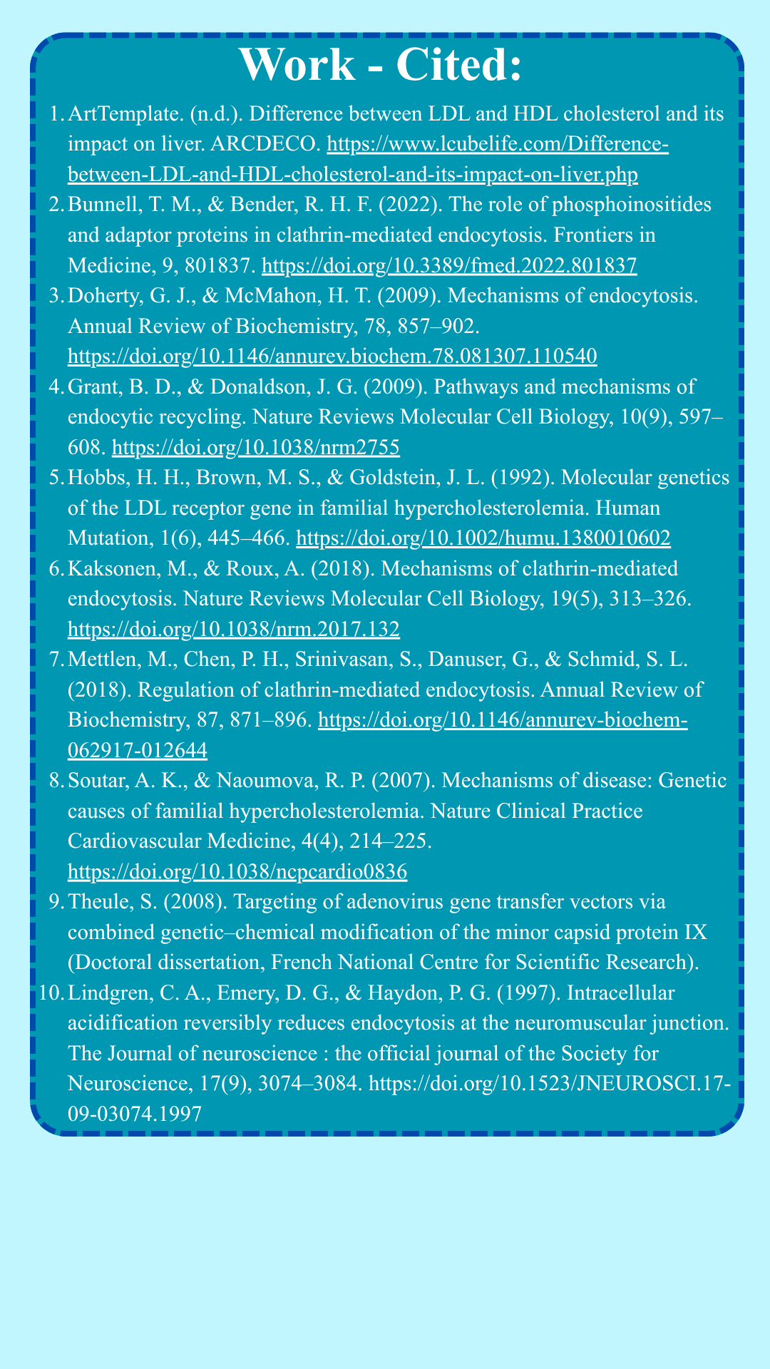 - We would like to thank Dr. Shackleford for her aid and support in helping us with our research. Her insight helped us connect a cellular mechanism with a real-world disease and deepen our understanding of how biological processes relate to human health. We would also like to thank the Biology Department at St. Mary’s University for providing us access to the environment, laboratory equipment, and resources that gave us the necessary information to successfully complete our research. We also extend our gratitude to the peers in our class for their willingness to help and for providing valuable advice to improve the clarity and appeal of our infographic. They offered constructive criticism that enhanced both our scientific understanding and our design skills. Finally, we are extremely grateful for the opportunity to perform this research and make meaningful connections between the disease and its underlying cellular mechanisms.
