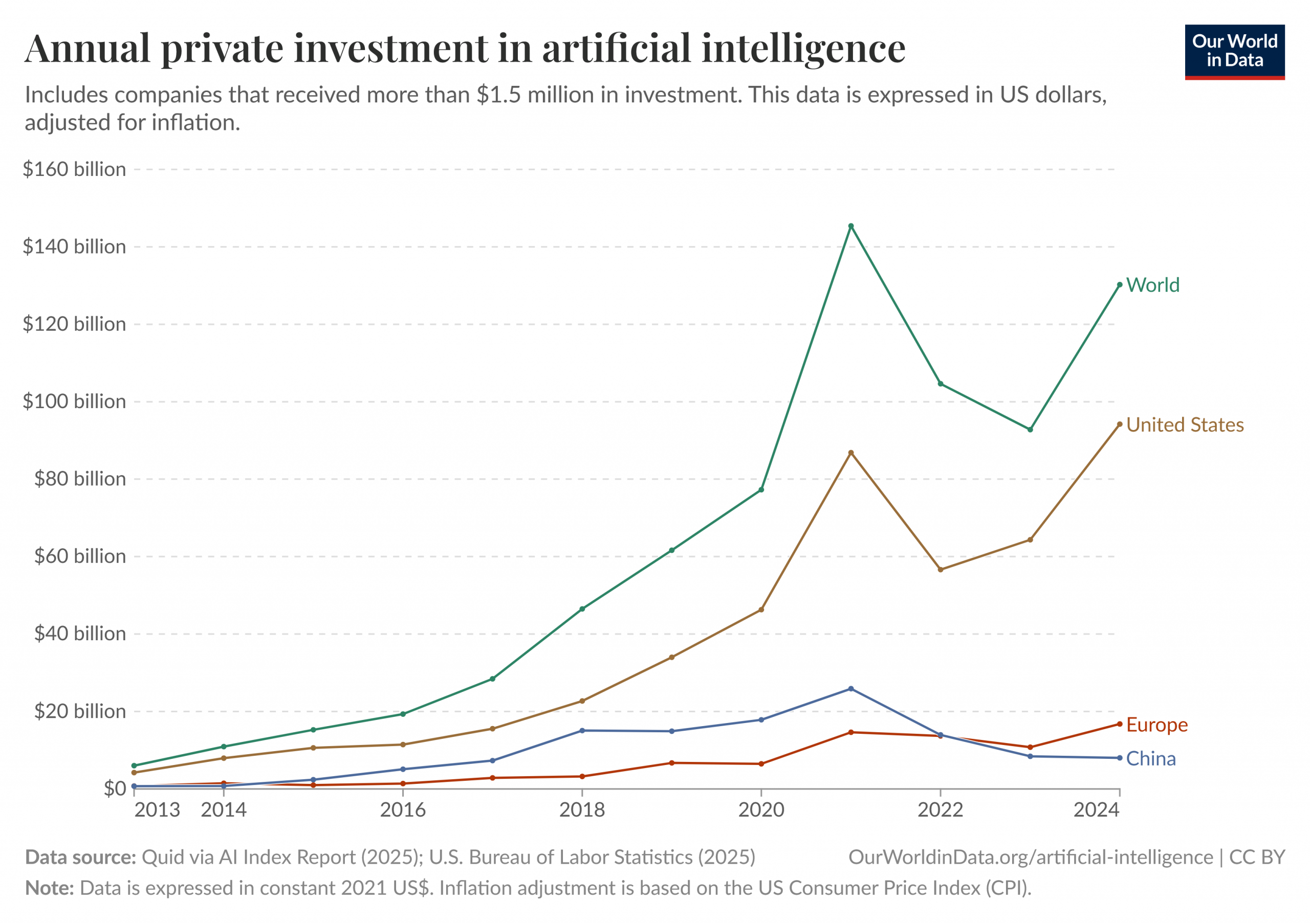 Big tech companies like OpenAI, Meta, and Nvidia have been spearheading AI’s operation for the last few years while AI continues to be the latest and greatest business frontier. All around the world, investments in AI technology have been increasing steadily since 2015 (Figure 1), with the United States currently leading by significant margin. As of 2025, AI investments now account for 92% of American GDP growth according to Yahoo Finance.4 This funding reflects the growth of the emerging AI industry, allowing it apply its products faster. Currently, 77% of computerized devices have an AI of some sort installed on them and is expected to rise still.5, and around 72% of businesses use AI in their operations.6 We are currently huddled around the fire’s warmth, watching as it sways in the cold wind. Another log is thrown into the pit.