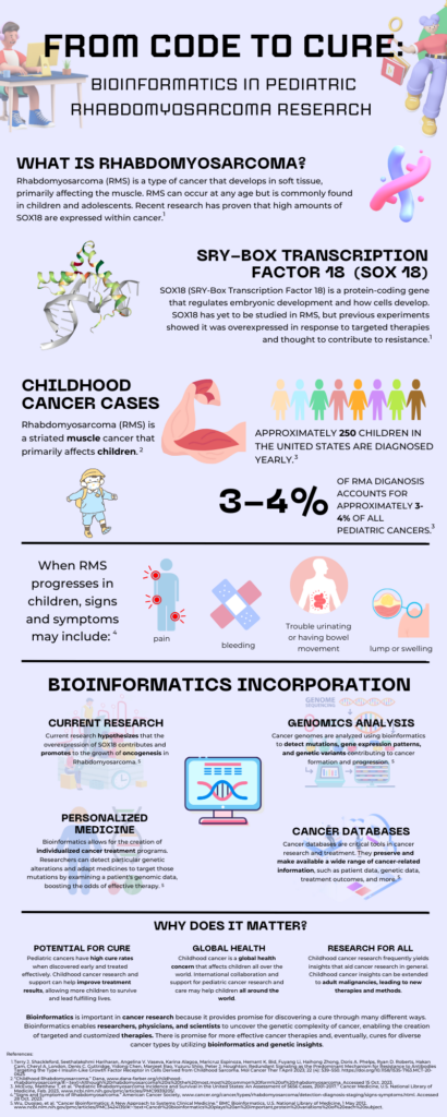 I love the title it’s really catchy. When reading this infographic, I was reminded that some of the information presented was from Dr. Shackleford’s research. I remember this because one of her previous research students gave a presentation on SOX18. This infographic is aesthetically pleasing and presents the information in a clear concise manner which is fantastic. Overall, you did a great job at highlighting the clinical significance of bioinformatics in Rhabdomyosarcoma.