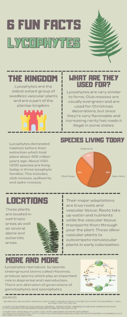 Great Infographic Natalie! I really liked your fun facts about lycophytes. I don’t really think they are talked about enough, I found it interesting that species living today of lycophytes are one of the earliest forms of plants. Nice work!