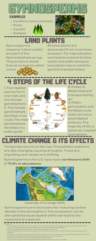 That’s so interesting! on a side note I enjoy the layout of your infographic. I feel it is easy on the eyes and doesn’t feel congested. Besides that, this was very informative. I never knew how imperative Gymnosperms were in reducing carbon dioxide. Another interesting topic you brought up was how global warming is effecting them.