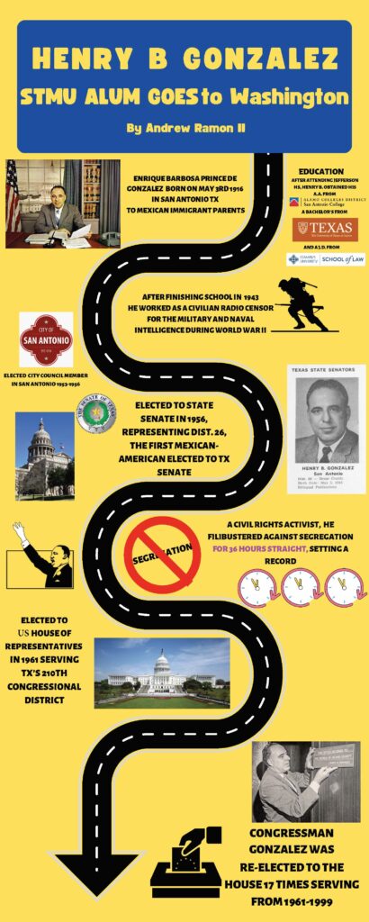 Truthfully, I did not know who Henry B Gonzalez was. Thank you for sharing his story. The fact that he protested for 36 hours straight is incredibly impressive. Thank her for providing detail in an engaging and eye-catching way. I appreciate how this information was relevant to the community we are in, as most of us are Hispanic and we go to school in San Antonio.