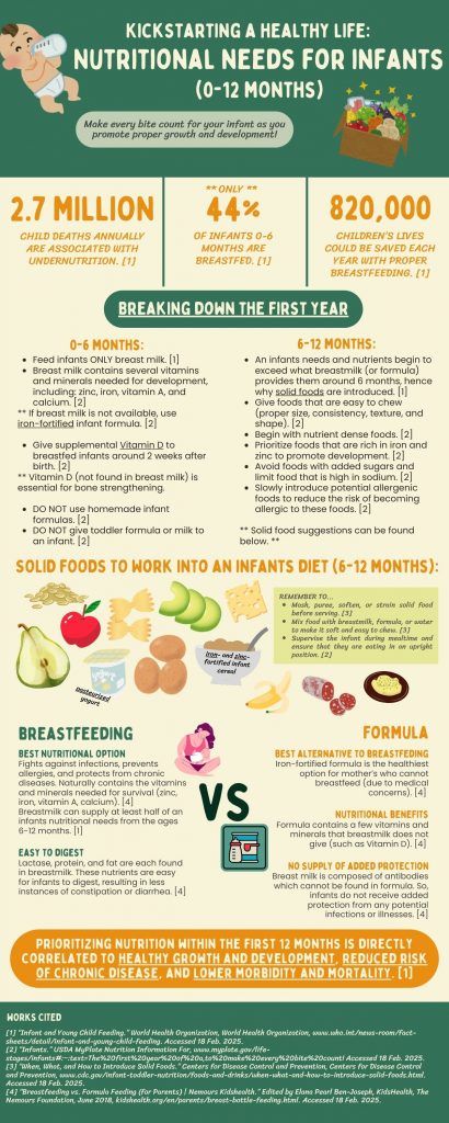 I didn’t realize how much goes into infant nutrition during the first year, and this infographic explained it in such a clear way. The 0–6 month and 6–12 month breakdowns were super helpful, especially the reminders about vitamin D and introducing solids slowly. I also liked how the breastfeeding vs. formula section gave facts without pushing one side too hard.