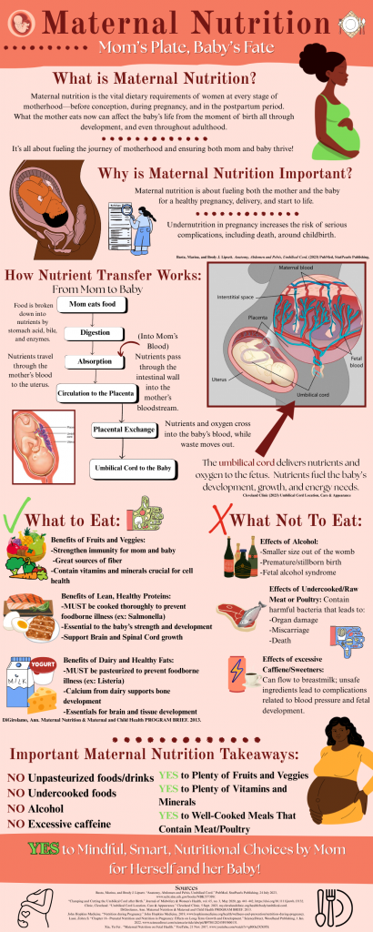 Maternal Nutrition: Fueling two lives through mindful nourishment. This project explores how nutrient transfer works from mom to baby, and how a mother’s diet supports fetal growth and lifelong health. What mom eats today shapes the strength, development, and future of her baby.