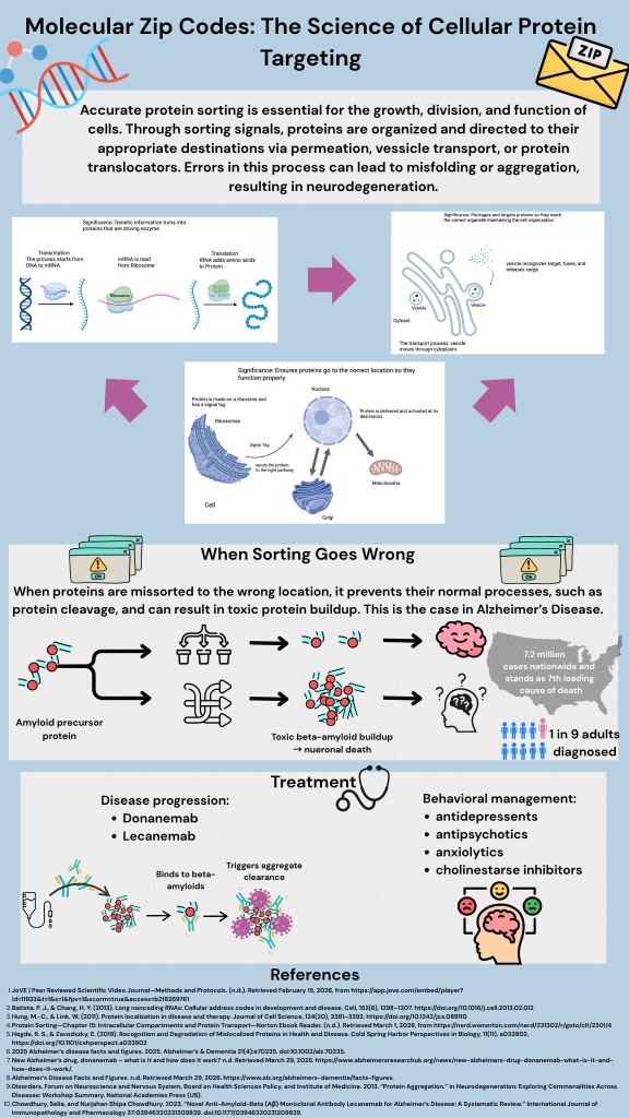 This infographic was designed to show the significance of cellular protein targeting and its crucial role in supporting normal cell function. We would like to acknowledge the researchers and educational sources whose work helped shape our understanding of protein sorting, vesicular transport and the issues of protein mislocalization in disease. This provided us with a scientific foundation in order to connect core cell biology concepts with real-world relevance, such as Alzheimer’s disease. We would also like to thank our materials and visual references for supporting us well within the organization and providing a clear format for our audience. This project overall helped reflect and learn how complex cellular processes really are and their importance.