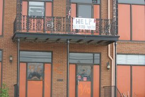 New Orleans after Hurricane Katrina Disaster. Sign on balcony “HELP NO FOOD NO WATER” 16, ioerror, 2005, CC BY-SA 2.0