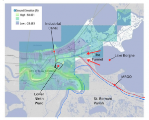 Following these two significant breaches to New Orleans flood protection levees, Hurricane Katrina began to make its initial landfall on the southeast coast of Louisiana at 6:10am. Despite having weakened from its peak intensity, Katrina made landfall as a high-end Category 3 hurricane with sustained wind speeds of 125mph. Due to it’s exceptionally large size, 400 miles wide, the entirety of the south eastern Louisiana coastline, including New Orleans, was now in the destructive path of the storm. At approximately 6:30am, Katrina pushed a 14-17 foot surge of seawater into the Mississippi River-Gulf Outlet (MRGO) and Lake Borgne. Once entering, these two storm surges converged in eastern New Orleans, in an area known as “The Funnel” (Fig.3) where the levee system narrowed significantly an headed towards the Industrial Canal.