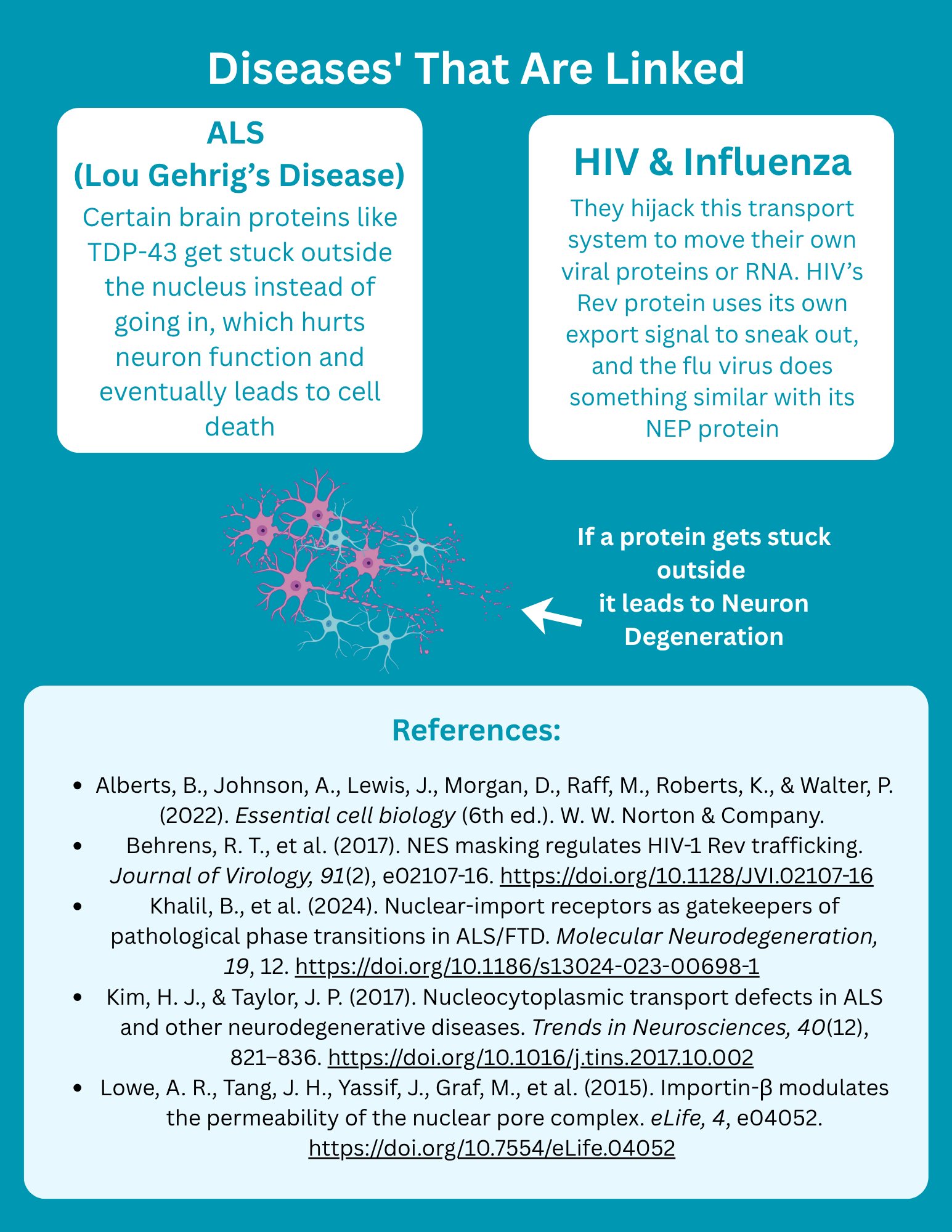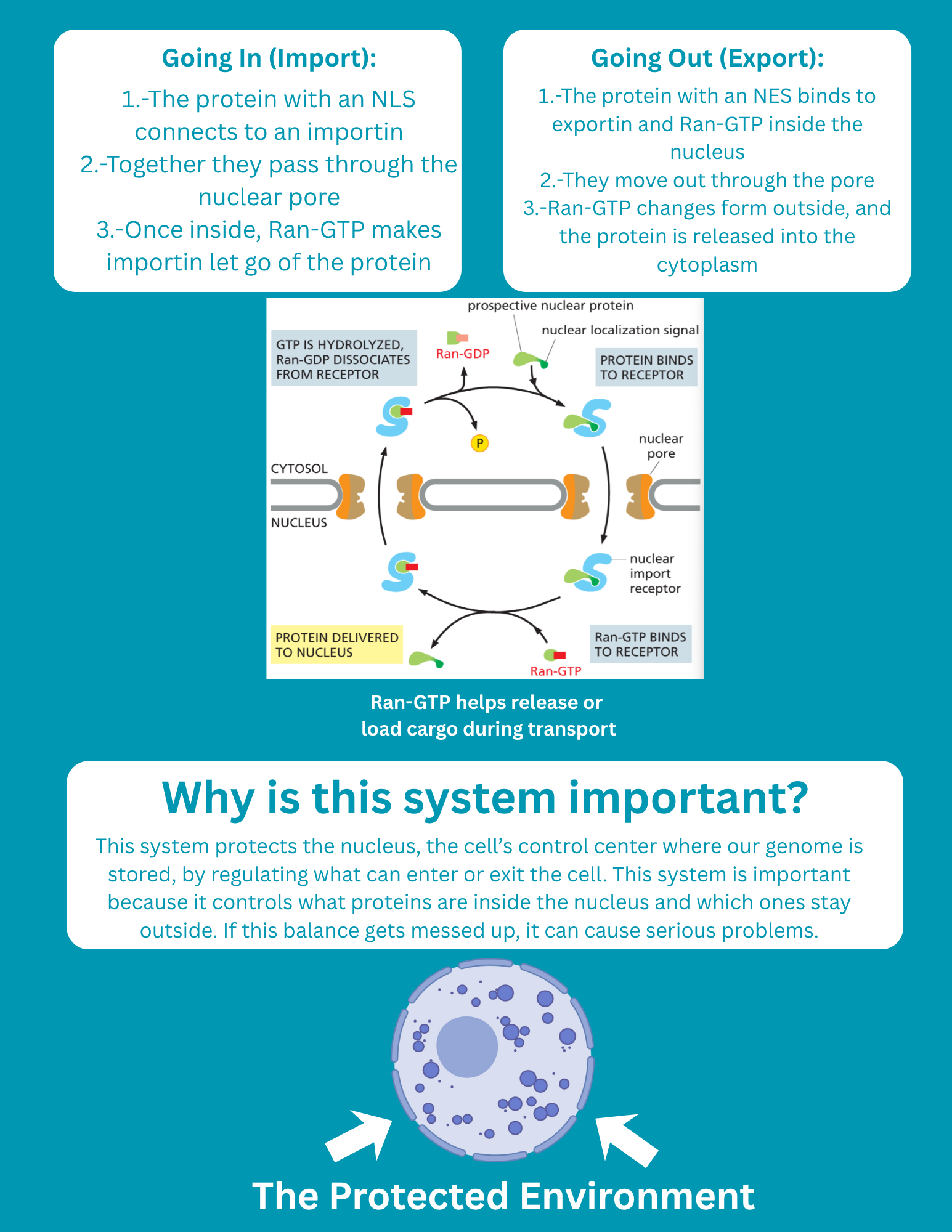 Nuclear Import and Export: The Role of Importins and Exportins was created to help explain how proteins move in and out of the nucleus, this process is essential for maintaining a cells health. The goal of this infographic was to present Nuclear Import and Export in a visually engaging and easily understandable format. I would like to sincerely thank Professor Terry Shackelford for her guidance and feedback while working on this infographic. Thank you for helping me better define NLS and NES along with the Ran-GTP’s role. Along with Professor Terry Shackelford I would also like to thank Angelica Cue-Leon, and Macarena Machado Combe who helped peer review this infographic and gave very insightful recommendations for changes. While working on this project it helped me better understand how to make a scientific infographic, better understand how the nuclear transport system works, and understanding the link between this system and well-known diseases.