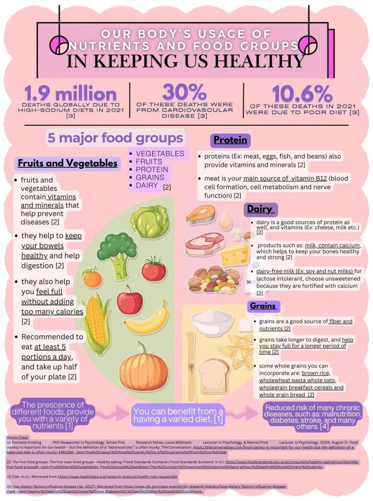 Hello! I like how this infographic shows the reader the importance of different food groups work together to keep us healthy. It highlights the importance of fruits, vegetables, protein, grains, and dairy. I like the design because it’s visually appealing and easy to follow. I also appreciate the use of images and simple language. It’s a great way to learn about healthy eating habits without getting confused with all the information.