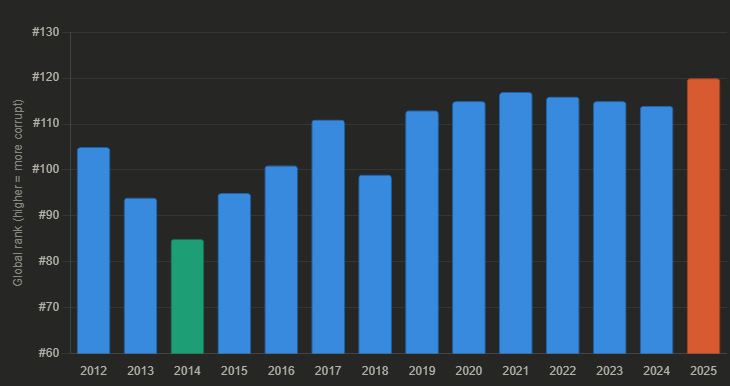 The Philippines’ corruption ranking from 2012-2025, according to the Transparency International Corruption Perceptions Index.21  Their lowest ranking in green, and their highest in red. Original image created by Christian Molina.