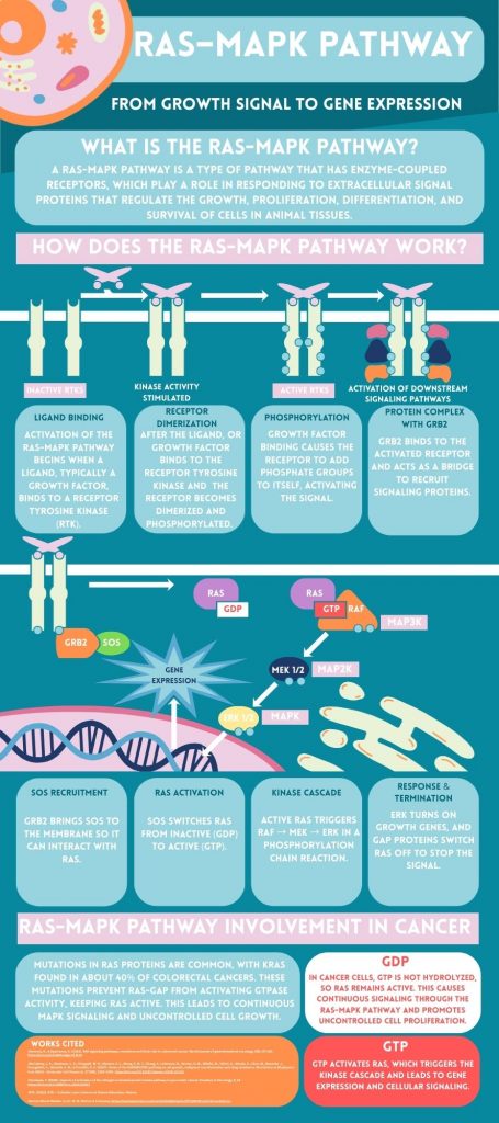 This infographic explains the Ras-MAPK pathway, an important process that helps cells respond to signals from their environment. This represents how cells take in growth signals and turn them into actions like growing, dividing, or surviving. The pathway plays a key role in keeping normal cell functions balanced, making sure cells only grow and divide when needed. It also emphasizes how sensitive this system is, since even small changes can disrupt normal signaling. When the pathway does not function properly, especially due to mutations, it can lead to continuous cell growth, which is closely linked to cancer development. Overall, the infographic highlights why the Ras-MAPK pathway is essential for normal cell behavior and how its dysfunction can have consequences for human health.