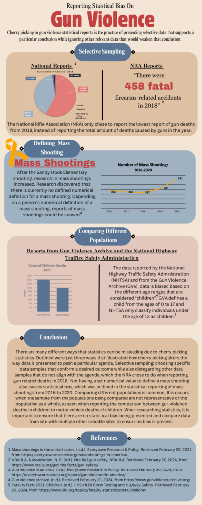 Your infographic on gun violence is absolutely captivating. As an avid hunter, delving into this topic has always intrigued me, and your study provided a wealth of insightful information. I found it particularly fascinating how the study outlined various ways statistics can be manipulated to suit the agenda of the researcher. It was truly enlightening.