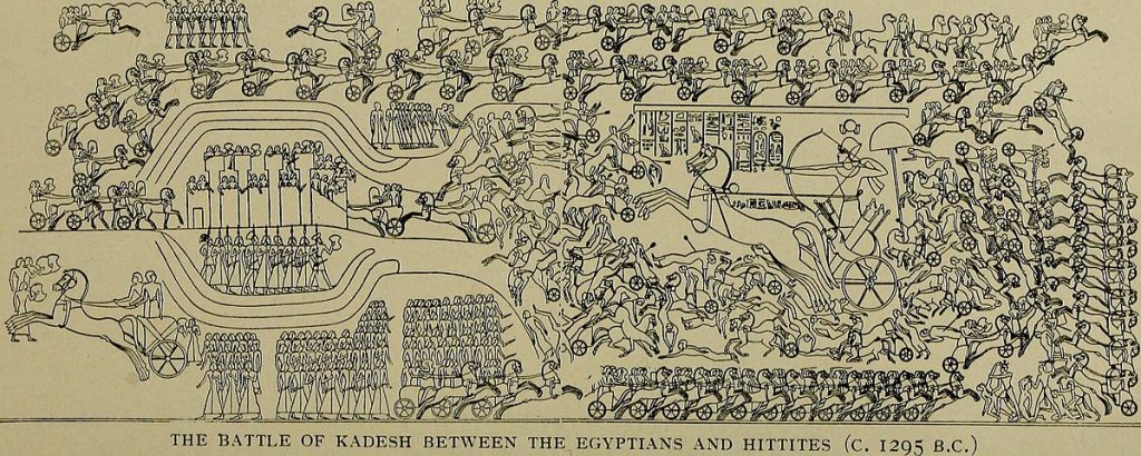 The battle involved the Egyptians and the Hittites, and it was over land in Syria that the Hittites had recently taken from the Egyptians. Both sides armed themselves with bronze weaponry and horse-drawn chariots equally equipped for a long and taxing battle. The siege by the Egyptians on Kadesh is known to have lasted three months.1 This battle involved between five to six thousand chariots, the largest such engagement in military history. The Hittites were known to be highly skilled in chariot-based combat due to the help of a horse trainer known as Kikkuli. Kikkuli’s teachings helped the horses to increase both endurance and stamina. His teachings were so well regarded that royalty in neighboring Indo-European civilizations adopted his teachings for their own.2 This advanced knowledge and practice that was available to the Hittites already put them at an advantage when facing the Egyptians on chariots. The Egyptians, however, had certain advantages that the Hittites lacked. The Egyptian army, under the command of Ramses II, contained 35,000 men, while the Hittite army, headed by Muwutallis II, only had 27,000 men. Despite their differences, both sides seemed able to face the opposing army with confidence.