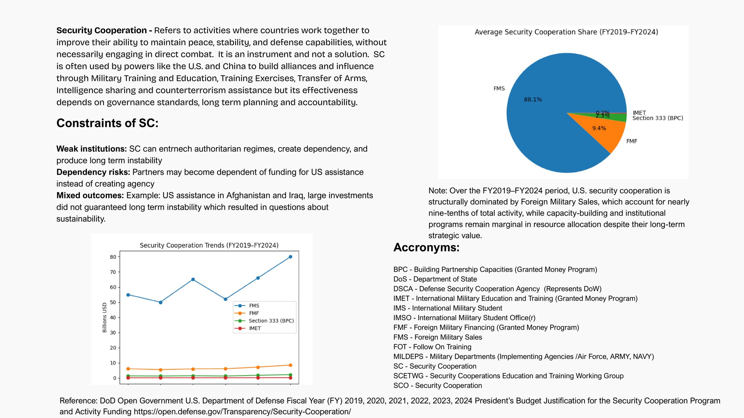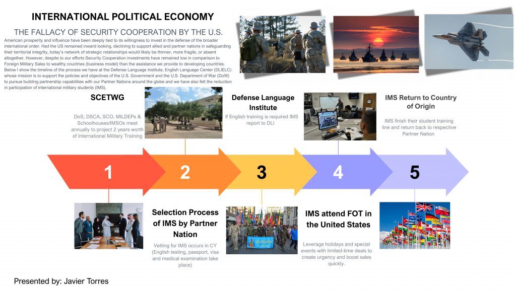 The growing narrative in Washington that Security Assistance (SA) and Security Cooperation (SC) have outlived their usefulness is less a reflection of reality than of frustration with uneven results. The problem isn’t the tool itself, it’s how it’s being used. Declaring security cooperation obsolete risks discarding one of the United States’ most cost-effective instruments of global influence at precisely the moment great-power competition is intensifying. The purpose of my research is to try to demonstrate that what makes Partner Nations to stop engaging with the United States are external factors such as competition with China especially with its investments in the West, lack of follow up with the Partner Nations, genuine interactions, corruption abroad and weak institutions in developing countries. Funding to support our international military training programs have also dwindled and more red tape has been institutionalized for their execution. I have firsthand experience and better access to the particulars that I can use to prove my argument along with the break down information per Combatant Command and Military Department at the Defense Language Institute (DLI), and area of responsibility.