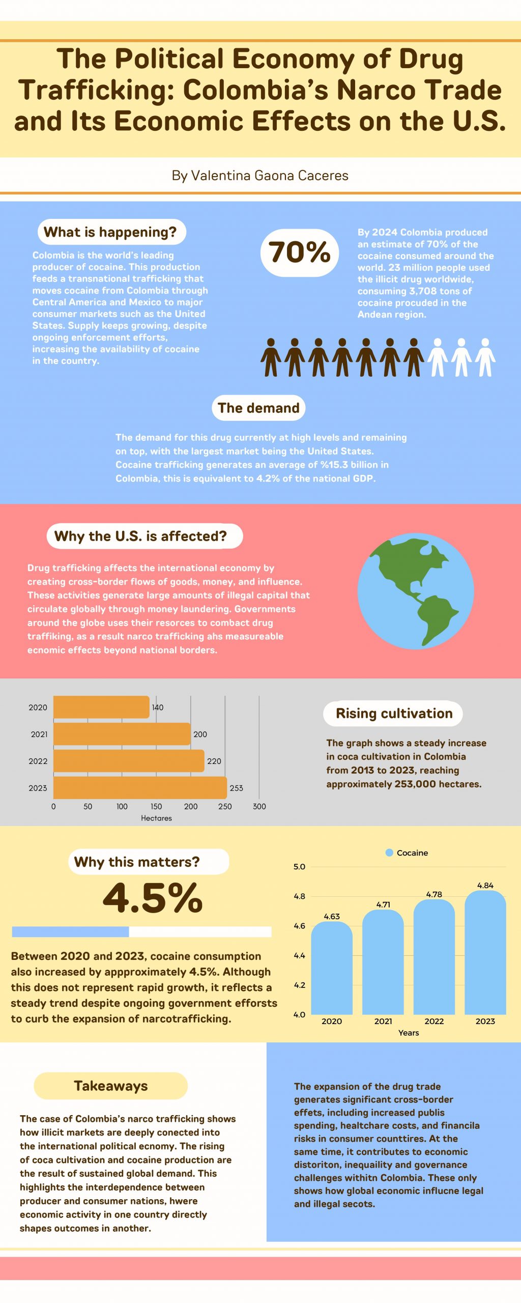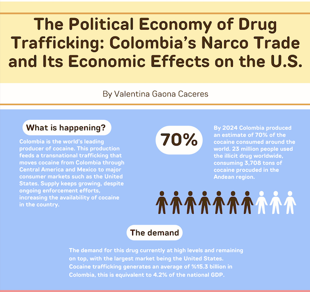 Colombia is the world’s leading producer of cocaine. This production feeds a transnational trafficking that moves cocaine from Colombia through Central America and Mexico to major consumer markets such as the United States. Supply keeps growing, despite ongoing enforcement efforts, increasing the availability of cocaine in the country. The expansion of the drug trade generates significant cross-border effects, including increased public spending, healthcare costs, and financial risks in consumer countries. At the same time, it contributes to economic distortion, inequality, and governance challenges within Colombia. These trends show how global economic influence affects both legal and illegal sectors.