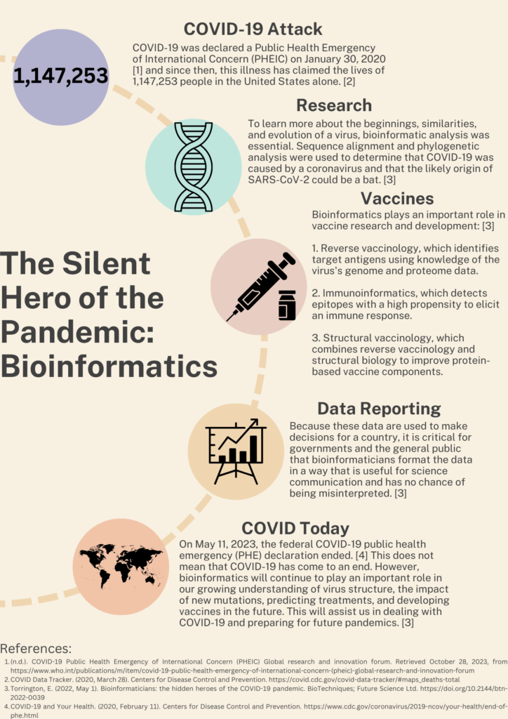 Very informative infographic! I didn’t realize that the speed at which COVID was “taken care of” was due to bioinformatics. It makes me wonder what stage we would be in if it weren’t for bioinformatics. Would we still be in lockdown? I’m honestly glad we don’t have to find out. This infographic was beautifully made and was very easy to follow, very good job!