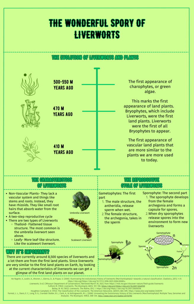 I really liked your theme and the colors you selected! I was fascinated by the visual history of the evolution of liverworts and plants. I had never heard of liverworts before, so the characteristics and reproductive cycle took me by surprise. It’s also worth noting that this is a glimpse of Earth’s very first terrestrial vegetation. Excellent work, and I thoroughly enjoyed reading your infographic!