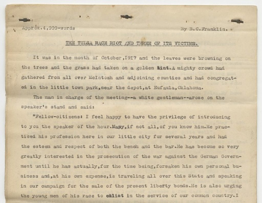 On the night of May 31, 1921, the black community of Tulsa Oklahoma’s Greenwood district would fall victim to one of the deadliest and most destructive episodes of racial violence in American history.1 As described in his manuscript, “The Tulsa Race Riot and Three of Its Victims,” Buck Colbert Franklin described the devastation of homes and businesses being bombed while black owners helplessly watched and were gunned down in the middle of the street that awful night. The prominent lawyer found himself frightened at the sound of multiple gunshots ringing in the air near his law office on Greenwood Avenue. Franklin witnessed the chaos of a feverish crowd, and suddenly he knew that he was witnessing a race riot, or “massacre,” as it was beginning to transpire.2
