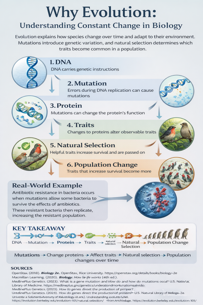 This infographic explains how evolution works by showing how DNA, mutations, proteins, and traits are all connected. The information came from class lectures, the OpenStax Biology textbook, and trusted sources like MedlinePlus and the University of California Museum of Paleontology. These sources helped explain how mutations happen and how they can change proteins, which then affect an organism’s traits. Natural selection then determines which individuals are more likely to survive and pass on those traits. The example of antibiotic resistance shows how evolution happens in real life. Evolution never stops because mutations are always occurring and environments are constantly changing, so populations continue to adapt over time. Overall, this project helped show how small changes in DNA can lead to bigger changes in populations, making evolution easier to understand.