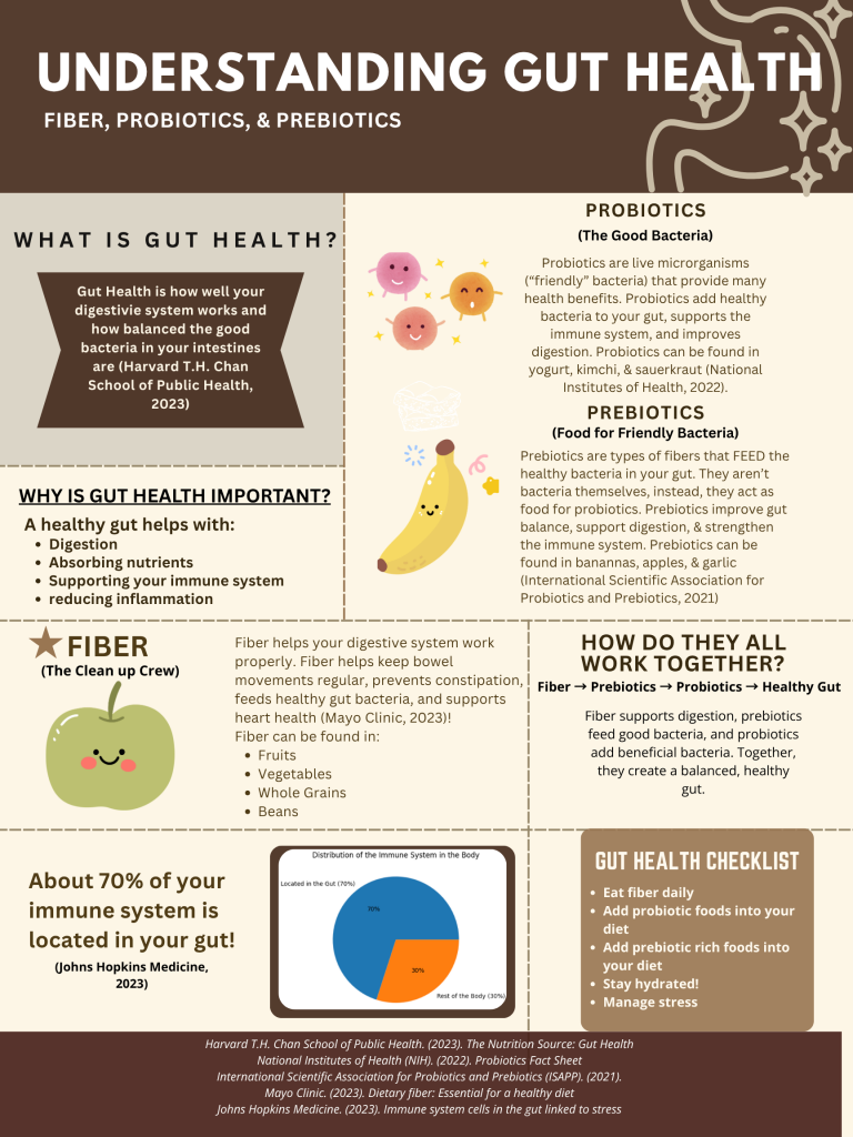 I would like to thank my professor, Dr. Boies, for their guidance and feedback throughout this project. Information for this infographic on gut health was gathered from credible sources including the Harvard T.H. Chan School of Public Health, the National Institutes of Health (NIH), Mayo Clinic, and Johns Hopkins Medicine. I would also like to give thanks to St. Mary’s University for allowing me a platform to share my research.