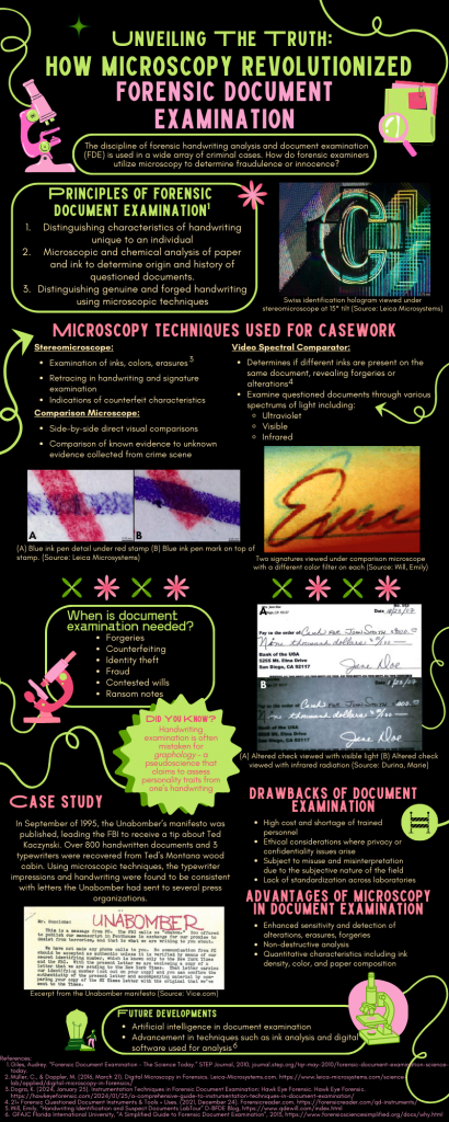 This poster is such a cool and creative way to break down how microscopy plays a huge role in forensic document examination. I love how it makes a pretty complex topic feel approachable and visually engaging—especially with the vibrant colors and real case examples like the Unabomber. The way it explains different tools, like the stereomicroscope and spectral comparator, really shows how science can reveal hidden truths in documents. It’s wild to think how even a tiny ink stroke can uncover forgeries or fraud. Definitely makes you appreciate the detail behind forensic work!