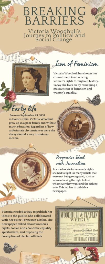I like your topic and the design reminds me of the Victorian era. The design is vintage and aesthetically pleasing. Nonetheless, I enjoyed reading about Victoria Woodhull’s journey to fight for women’s political and social freedom. If it wasn’t for her women wouldn’t be where they are at today. Finding out that she helped paved the way for the 19th Amendment is inspirational. I really enjoyed your topic and this infographic should be posted during International Womens Day !