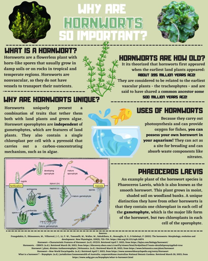 This is a very interesting and informative infographic about hornworts and their importance. Before reading this infographic, I had never heard of this plant and this graphic did a great job of explaining hornworts with its information, example and multiple graphics. Overall, this infographic is visually appealing, informative on the topic, and seemed very easy to able to follow along.