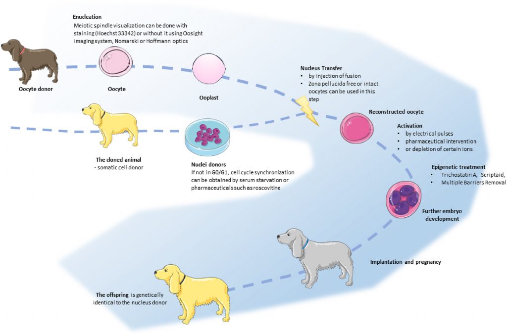 Pet cloning is done through a process called somatic cell nuclear transfer (SCNT). In the process of SCNT, a somatic cell is taken from a tissue sample provided by the animal that is to be cloned. The nucleus is removed from a donor oocyte in order to remove the DNA from the donor cell. The somatic cell is then transferred to the enucleated oocyte. The oocyte then reconstructs. Next, the cell is chemically or electrically stimulated in order to encourage embryonic development of the cell. An embryo can then be implanted in a surrogate mother. The offspring produced will be genetically identical to the animal from which the somatic cell sample was taken.1